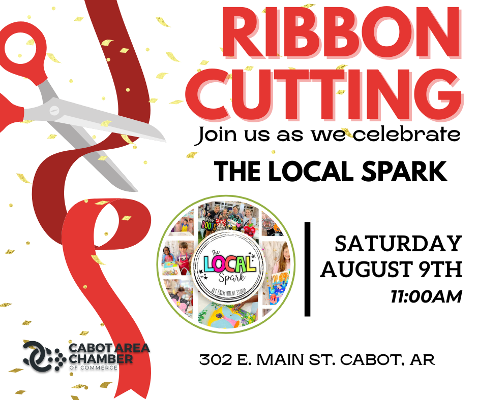 DESCRIPTION:🎉 You're Invited to the Grand Opening of The Local Spark! 🎉Join the Cabot Area Chamber of Commerce as we help welcome The Local Spark to the Cabot community with an official Ribbon Cutting Ceremony and Grand Opening Celebration this Saturday\, August 9th at 11AM!📍 Where: The Local Spark Studio (302 E. Main Street\, Cabot\, AR)\n🗓️ When: Saturday\, August 9th   11:00 AMWhether your child is picking up a paintbrush for the first time or you're just looking for a fun\, relaxing night out with friends The Local Spark offers something for everyone. From open studio hours to group classes and special events\, this vibrant creative space is designed to inspire artists of all ages and skill levels.🎨 What to Expect:\n✨ Ribbon cutting with Chamber & Community\n🖌️ Studio tours & art activity sneak peeks\n🥳 Fun\, family-friendly atmosphere\nCheck out everything they offer at:\n🔗 https://www.thelocalsparkcabot.com/Let's support this new local business that's sparking creativity and connection in Cabot!\nCome celebrate with us and bring the whole family!