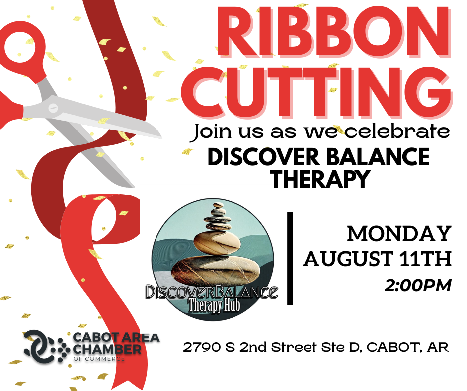 DESCRIPTION:🎉 Join us in welcoming a new business to Cabot!\nHelp us celebrate the grand opening of Discover Balance Therapy Hub with an official ribbon cutting on Monday\, August 11th at 2:00 PM!📍 Location: 2790 S 2nd Street\, Suite D\, Cabot\, ARDiscover Balance Therapy Hub is a solo mental health practice offering Individual\, Family\, Sand Tray\, and Play Therapy services. Come meet the team\, tour the space\, and help us give them a warm Cabot Chamber welcome!We hope to see you there as we support another incredible small business making a difference in our community.