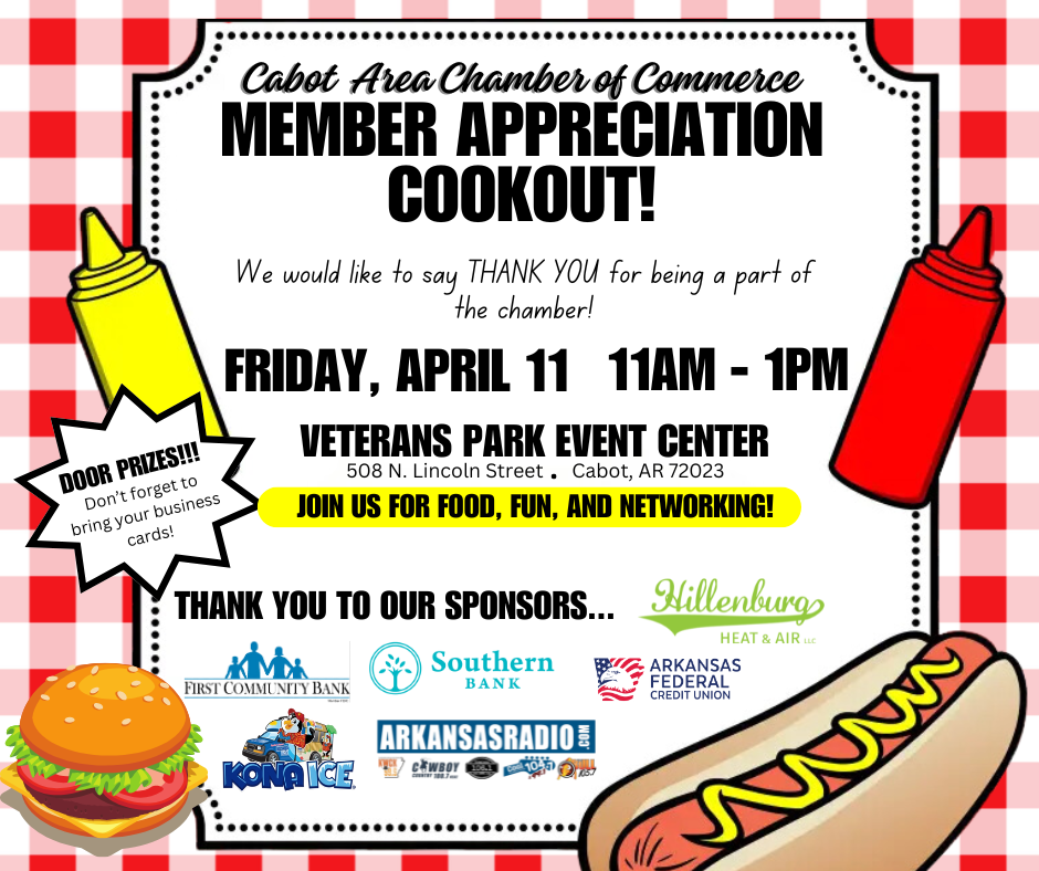 Join us for the Cabot Area Chamber of Commerce Membership Cookout—a fun afternoon of food, networking, and giveaways!
